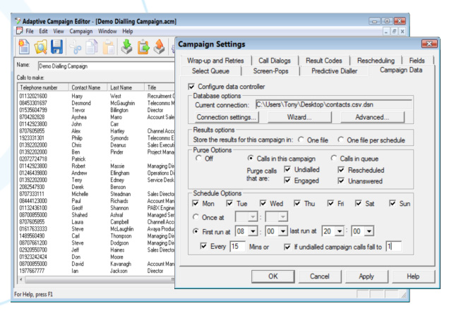 The Adaptive Predictive Dialler controls dedicated extensions on your telephone system, using them to make many telephone calls at the same time. The more calls it makes, the more chance of having a call answered. As soon as a call is answered, it is transferred to a user. This means that users talk to more people per hour. With the Adaptive Predictive Dialler, campaigns can be set up in minutes using a very easy-to-use campaign editor. The Adaptive Campaign Editor makes it simple to import call lists and set call outcome codes and dialling parameters. If combined with Adaptive CTI, you can also assign screen-pops to activate as each call is presented to the user.